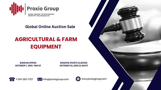- PROXIO GROUP AUCTIONSFrom October 1st to 15th, Proxio Group brings you the Agricultural & Farm Equipment Auction—your chance to power up your farm with top-tier machinery at unbeatable prices. Tractors, harvesters, sprayers, and more—trusted brands & ready to work.